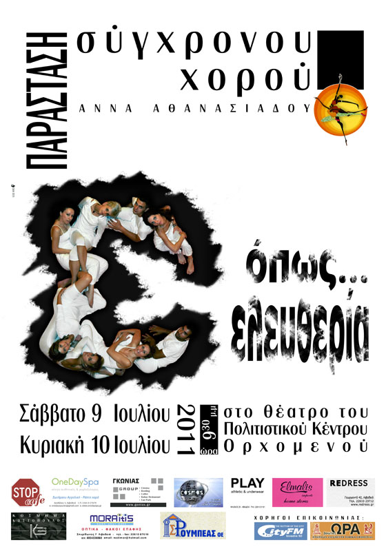 Το τμήμα σύγχρονου χορού της σχολής παρουσίασε στις 9 και 10 Ιουλίου 2011 στο Δημοτικό Θέατρο Ορχομενού την παράσταση «Ε όπως… ελευθερία». Μία παράσταση αφιερωμένη στην έννοια της ελευθερίας. Την ελευθερία που απολαμβάνουμε, στερούμαστε, διεκδικούμε, θυσιάζουμε. Την ελευθερία που δικαιούμαστε και απαιτούμε. Την ελευθερία ως πηγή έμπνευσης και ενέργειας, έκφρασης και δημιουργίας.